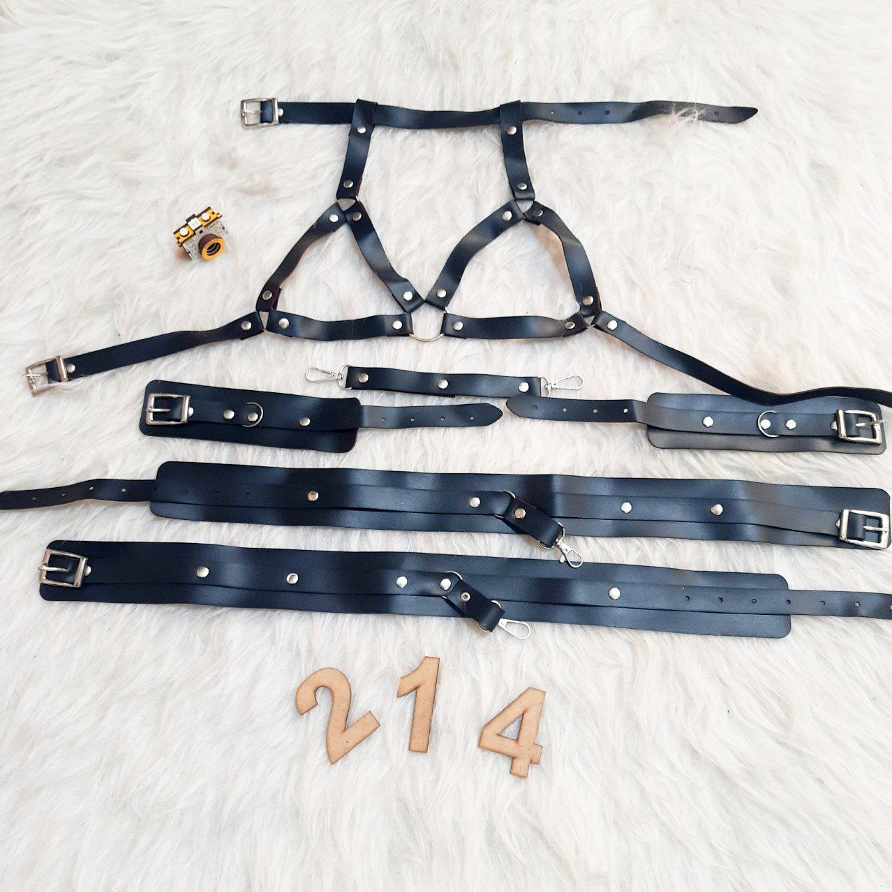 ست کامل: سوتین چوکر دار، دو عدد تسمه دور ران با امکان قلاب شدن به زیر سینه جهت بالا نگهداشتن پاها، دو عدد دستبند و رابط و بند چوکر