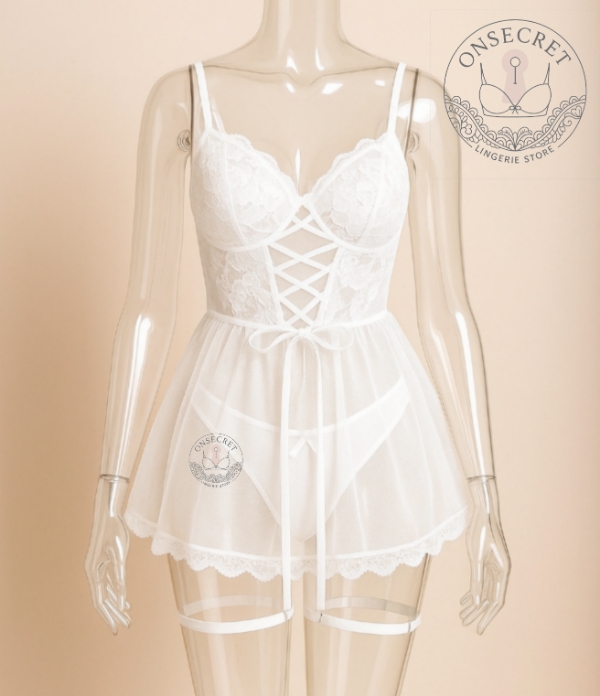 مدل لباس خواب: قسمت سینه گیپور فنردار، دامن کلوش با نوار گیپور پایین دامن