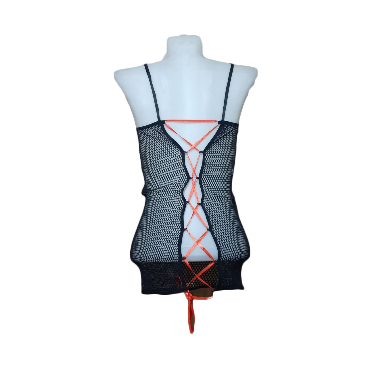 مدل لباس خواب: بند سرشانه قابل تنظیم، پشت باز با بند ضربدری، کوتاه روی باسن
