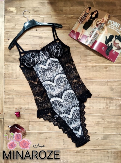 هارنس دار، دکلته، پشت سینه قزن دار، بند سرشانه از جلو تور دار و قابل تنظیم قد