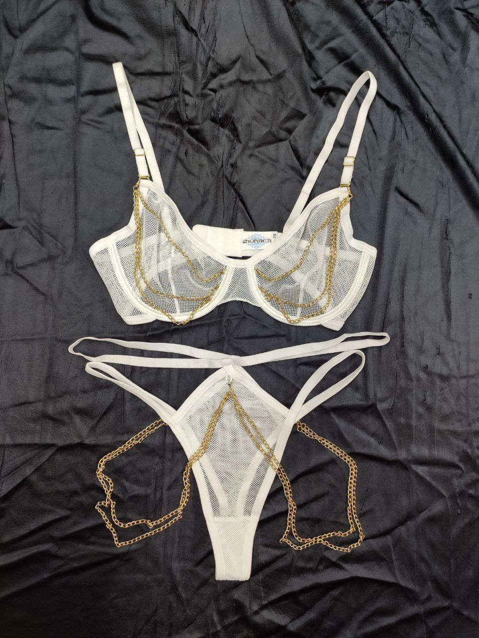 این ست شورت و سوتین زنانه زنجیردار و فنردار جذاب با کد M476 در رنگبندی مشکی، قرمز، سفید مناسب دو سایز ۷۵ و ۹۰ میباشد. برای دیدن عکس تنخور اینجا کلیک کنید.