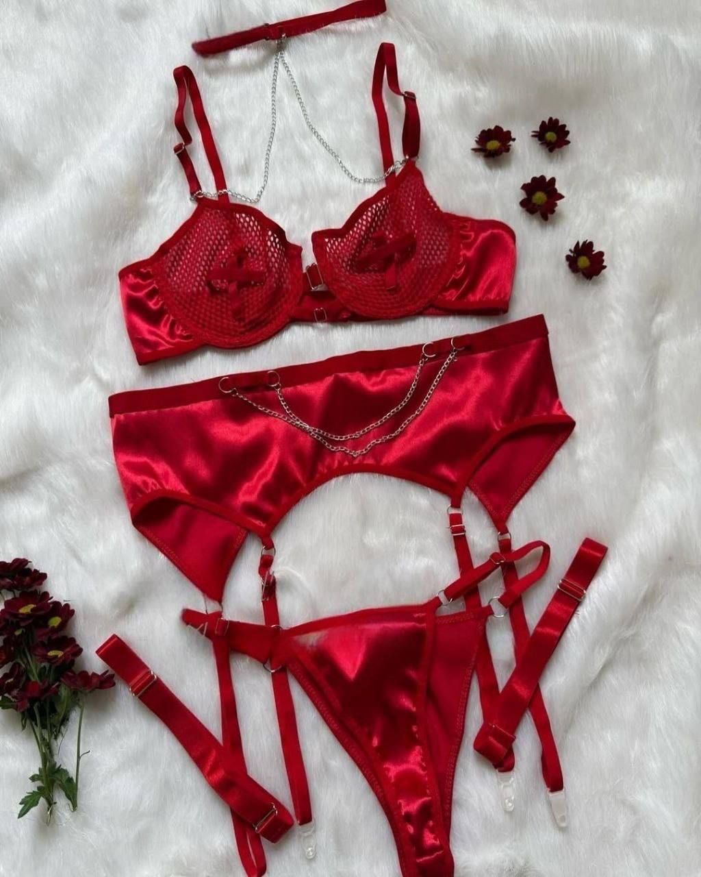 این ست ۳ تکه لباس زیر فانتزی زنانه بسیار خاص با کد 8030 شامل سوتین فنردار تور زنبوری، بند جوراب متصل به تسمه دور پا، شورت فانتزی بکلس همراه زنجیر تزئینی قابل جداسازی در قسمت های سوتین و شورت با رنگبندی قرمز و مشکی مناسب سایزبندی :(۸۰-۸۵)L(۷۰-۷۵) ,XL میباشد. برای دیدن عکس تنخور اینجا کلیک کنید.