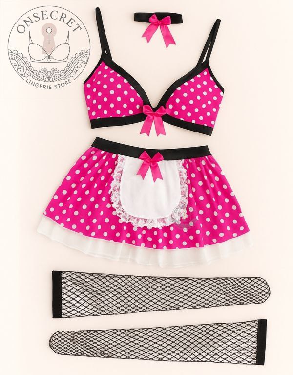 این ست کاستوم فانتزی خدمتکاری شامل سه تکه: سوتین، دامن و جوراب تور، با طراحی خاص و پارچه نرم و سبک تهیه شده است. ترکیب رنگ پارچه خال دار همراه با روبانها و پیشبند سفید گیپوردوزی شده، جلوهای چشمنواز و جذاب به این مجموعه میدهد. برای دیدن عکس تنخور اینجا کلیک کنید