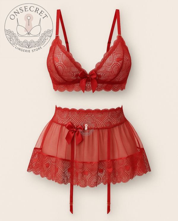 این ست لباس زیر زیبا و خاص، شامل چهار تکه شامل سوتین دانتل، شورت، دامن تور کوتاه و جوراب توری فانتزی است. طراحی ظریف پارچه دانتل مشکی با نقشهای شیک، در کنار حاشیههای تور و پاپیونهای ساتن، جلوهای چشمگیر و مجلل به این ست داده است. برای دیدن عکس تنخور اینجا کلیک کنید