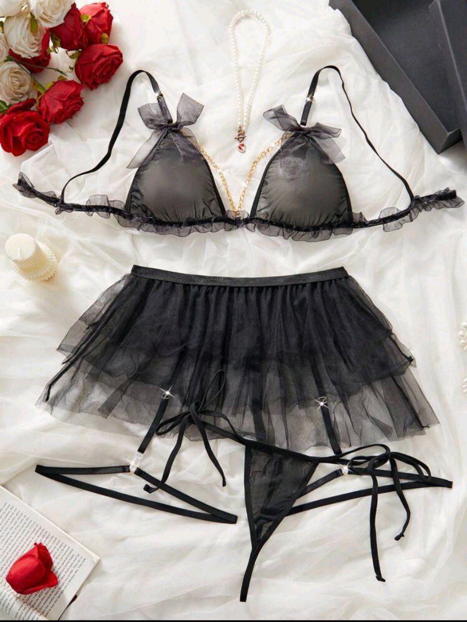 این ست لباس زیر فانتزی سهتکه شامل سوتین توری بدون فنر با طراحی جذاب و بندهای زینتی طلایی، شورت فانتزی بکلس و بند جوراب دامنی دلبریست که جلوهای مدرن و خاص به استایل شما میبخشد. دامن کوتاه از لایههای تور سبک و موجدار تهیه شده که بههمراه گارترهای قابل تنظیم، حس فانتزی و آزادی را به شما هدیه میدهد. برای دیدن عکس تنخور اینجا کلیک کنید