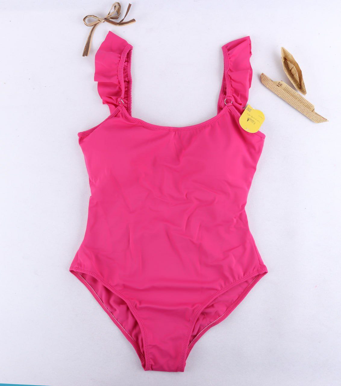 بندهای سرشانه تزئین شده با چین پلیسه، یقه گرد و در قسمت جلو ساده است، پشت مایو باز بوده و با دو بند افقی برای نگهداشتن جلوی لباس در جای خود طراحی شده