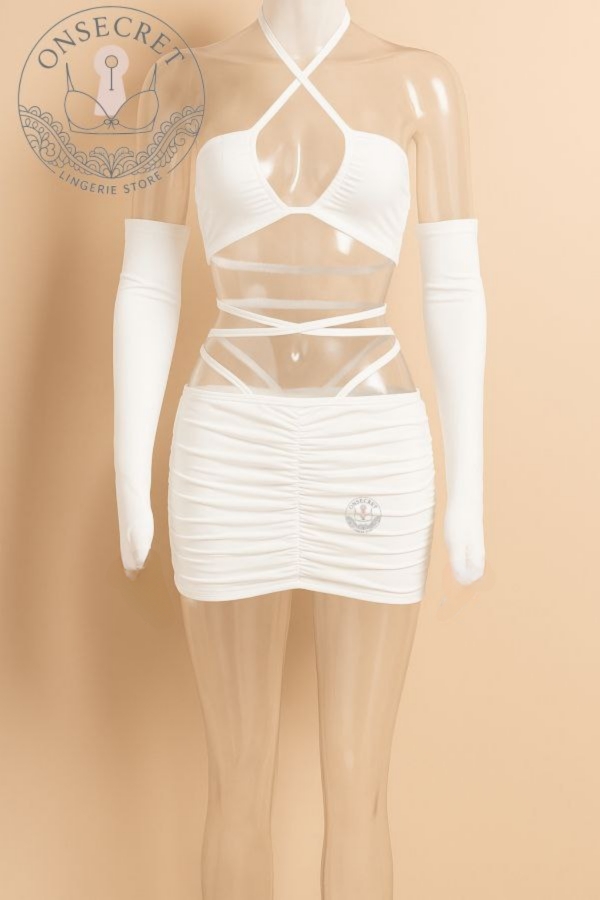 این ست خاص و جسورانه شامل بالاتنه کراسدار، دامن کوتاه و دستکشهای بلند که ظاهری منحصر به فرد و متفاوت خلق میکند. طراحی بندهای ضربدری روی شانه و دور کمر، استایل را جذابتر کرده و جلوهای مدرن و فانتزی به آن بخشیده است. برای دیدن عکس تنخور اینجا کلیک کنید