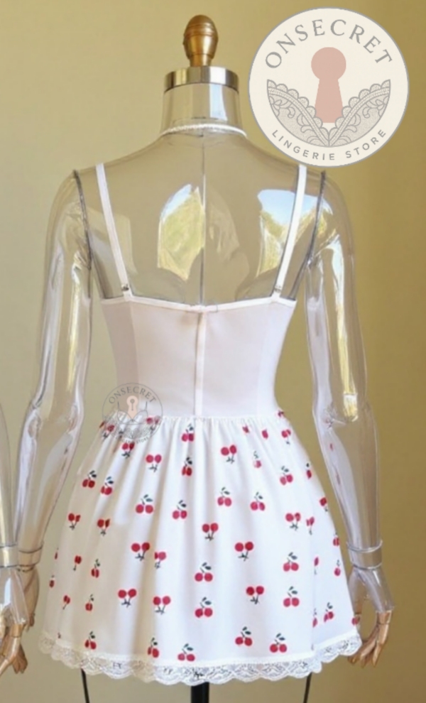 قسمت بالاتنه فنردار از دانتل طرحدار ظریف ساخته شده که به زیبایی روی بدن مینشیند و جلوهای بازیگوشانه ایجاد میکند. دامنی سبک و چیندار با پارچه نرم طرح گیلاس و لبه دانتلدوزیشده، حس خنکی و راحتی را در کنار ظاهر خاص فراهم میآورد. بندهای قابل تنظیم، تناسب کامل با اندام را تضمین میکنند.