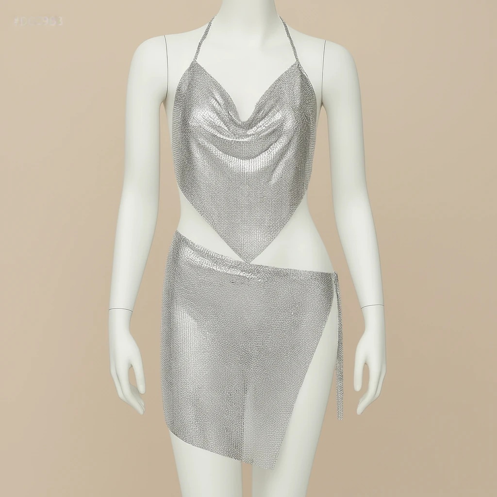 دکلته آزاد پشت باز، بند پشت سینه و دور گردن زنجیری رگلاژدار، پایین تاپ برش مثلثی