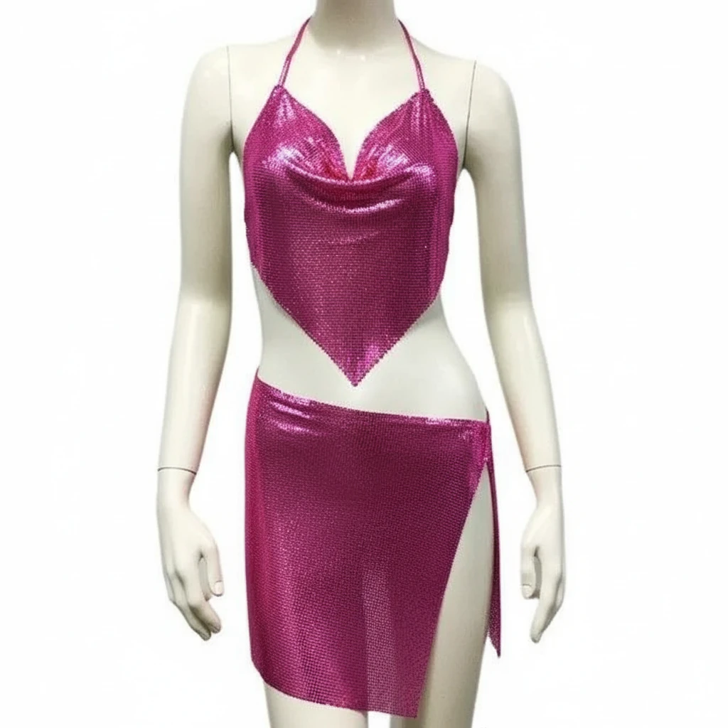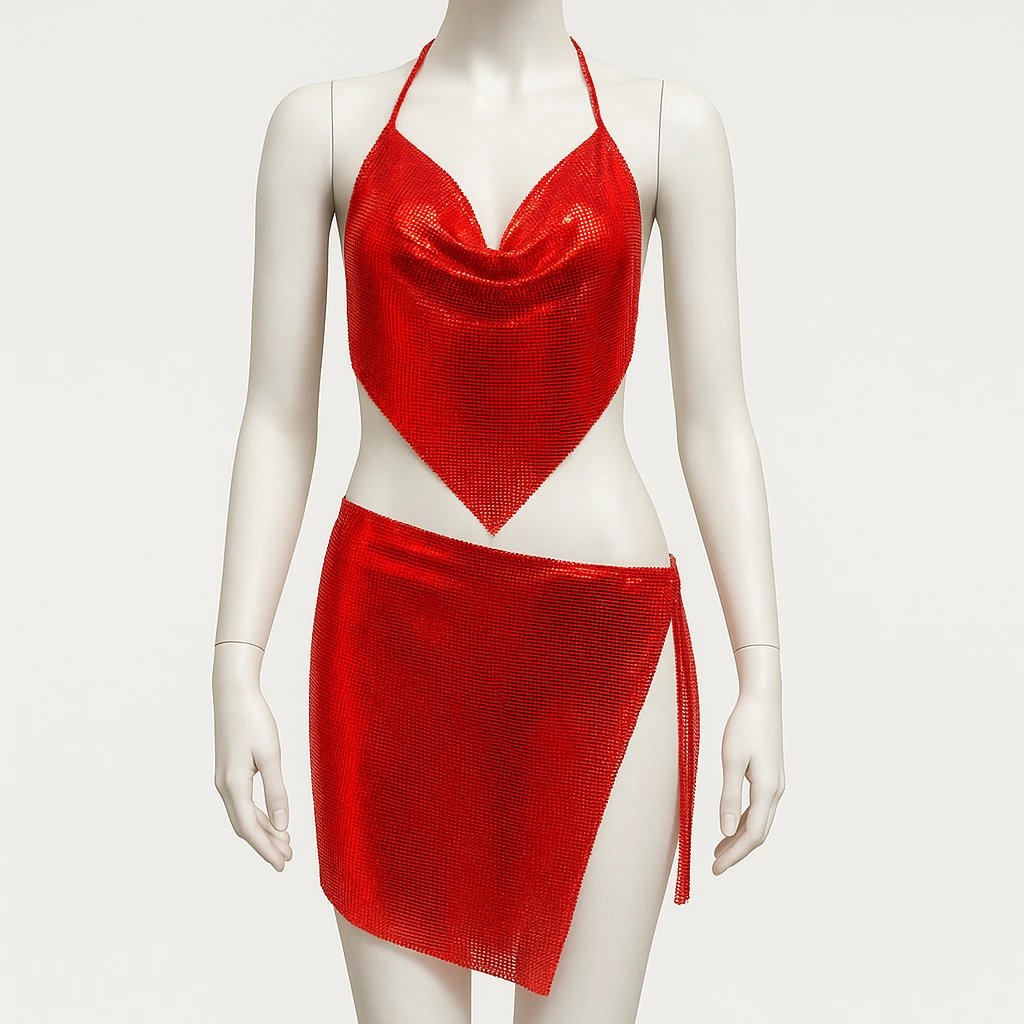 این ست تاپ و دامن دیسکویی براق با طراحی فانتزی و جذاب، جلوهای خیرهکننده برای مهمانیها و فضاهای خاص ایجاد میکند. پارچه دیسکویی سبک و انعطافپذیر بوده و به خوبی بر فرم بدن مینشیند. تاپ دکلته با آویز آزاد و دامن کوتاه نامتقارن، ظاهری مدرن و متفاوت به استایل میدهد. برای دیدن عکس تنخور اینجا کلیک کنید